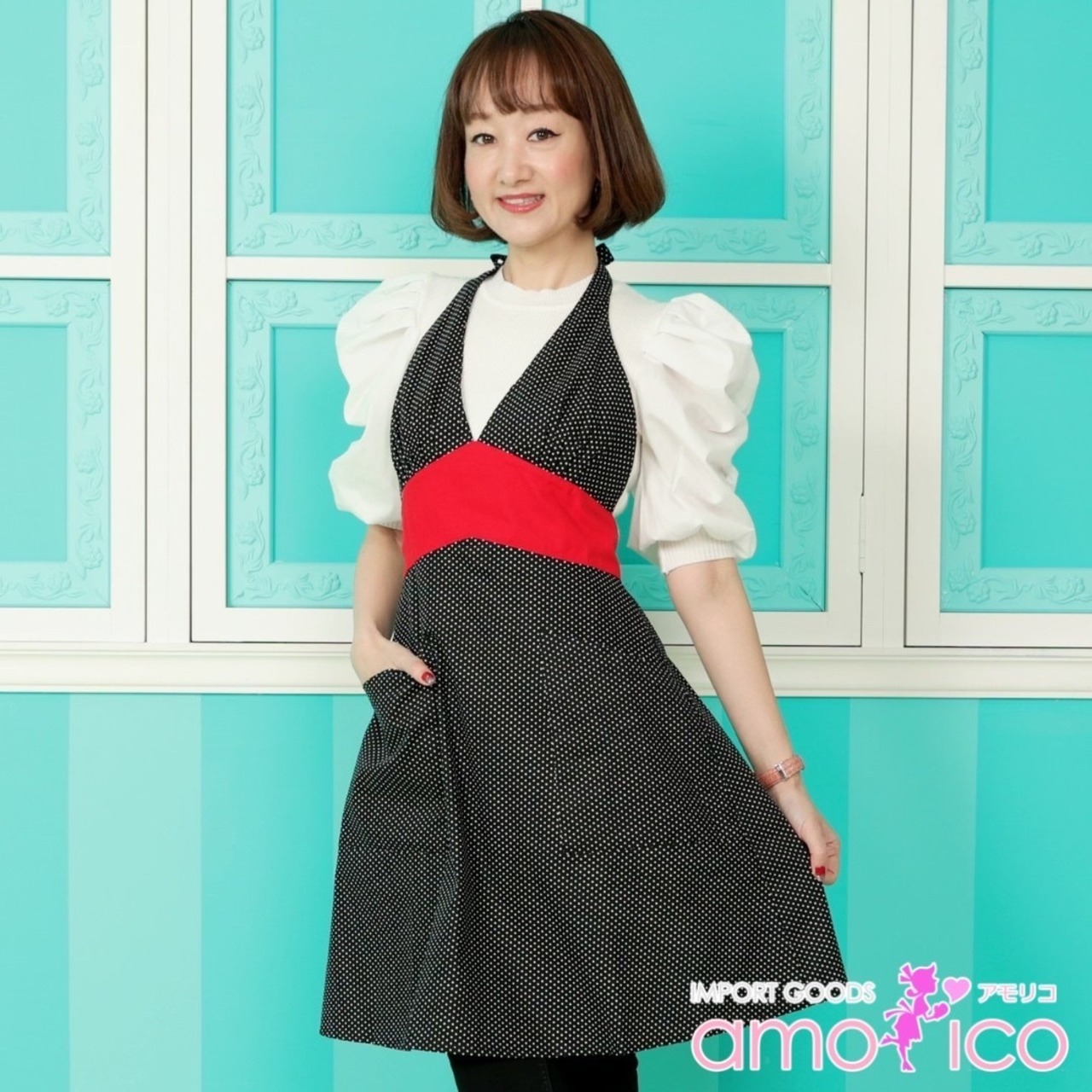 定番のブラック地にホワイトドット柄のマドモアゼルエプロンは太めな真っ赤なウエストバンドがとってもエレガントなエプロンです。