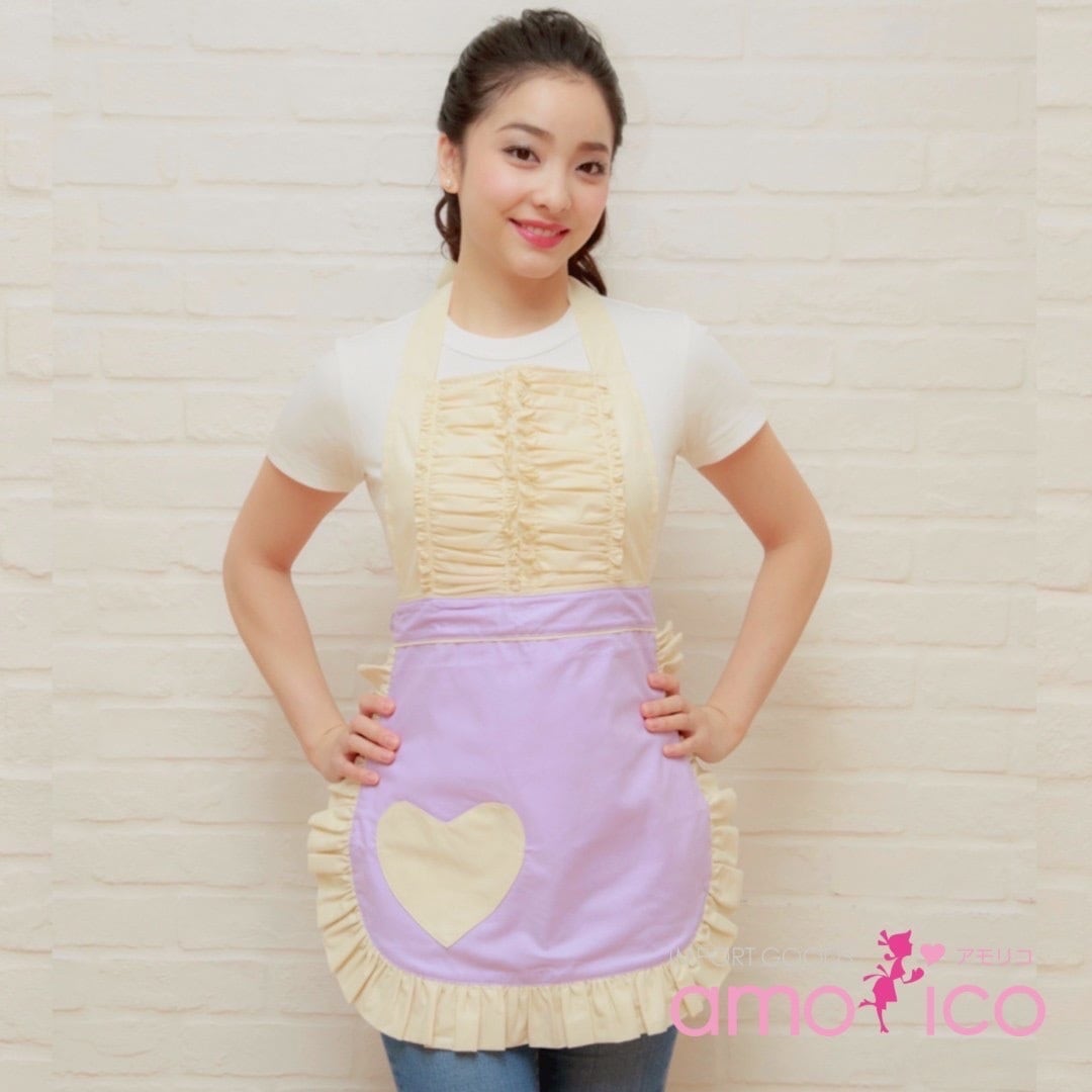 オフホワイト地の胸当てとフリル、ライラックの前掛け部分がちょっとレトロで可愛いエプロンです。